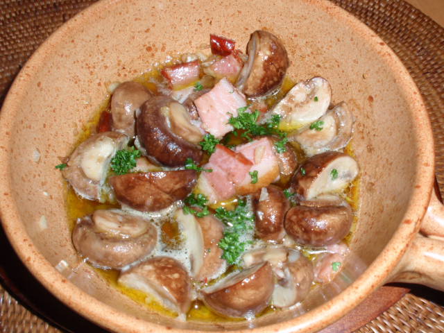 ③マッシュルームと刻みベーコンを鍋に入れて、マッシュに火が通る