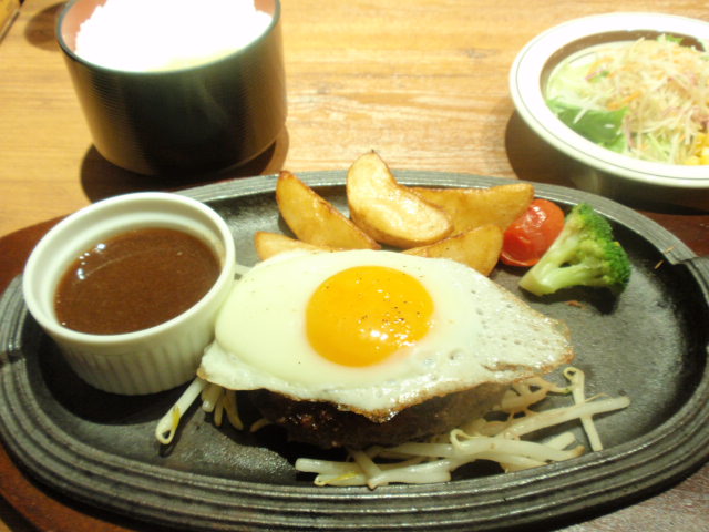 ミディアムレアで出てくるハンバーグが名物。目玉焼きやガーリック