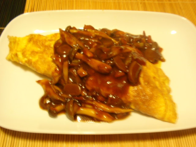 ④別の鍋で、きのこの残りをバターでソテーして、市販のデミグラスソース