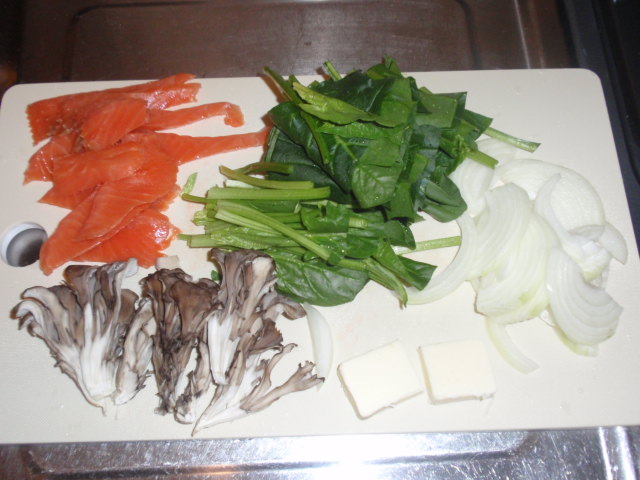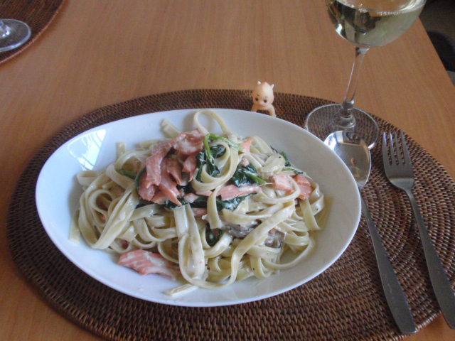 今日は、簡単クリームパスタ。材料は、スモークサーモン、ほうれん草、玉葱、生クリーム、きのこ類、バター等々。